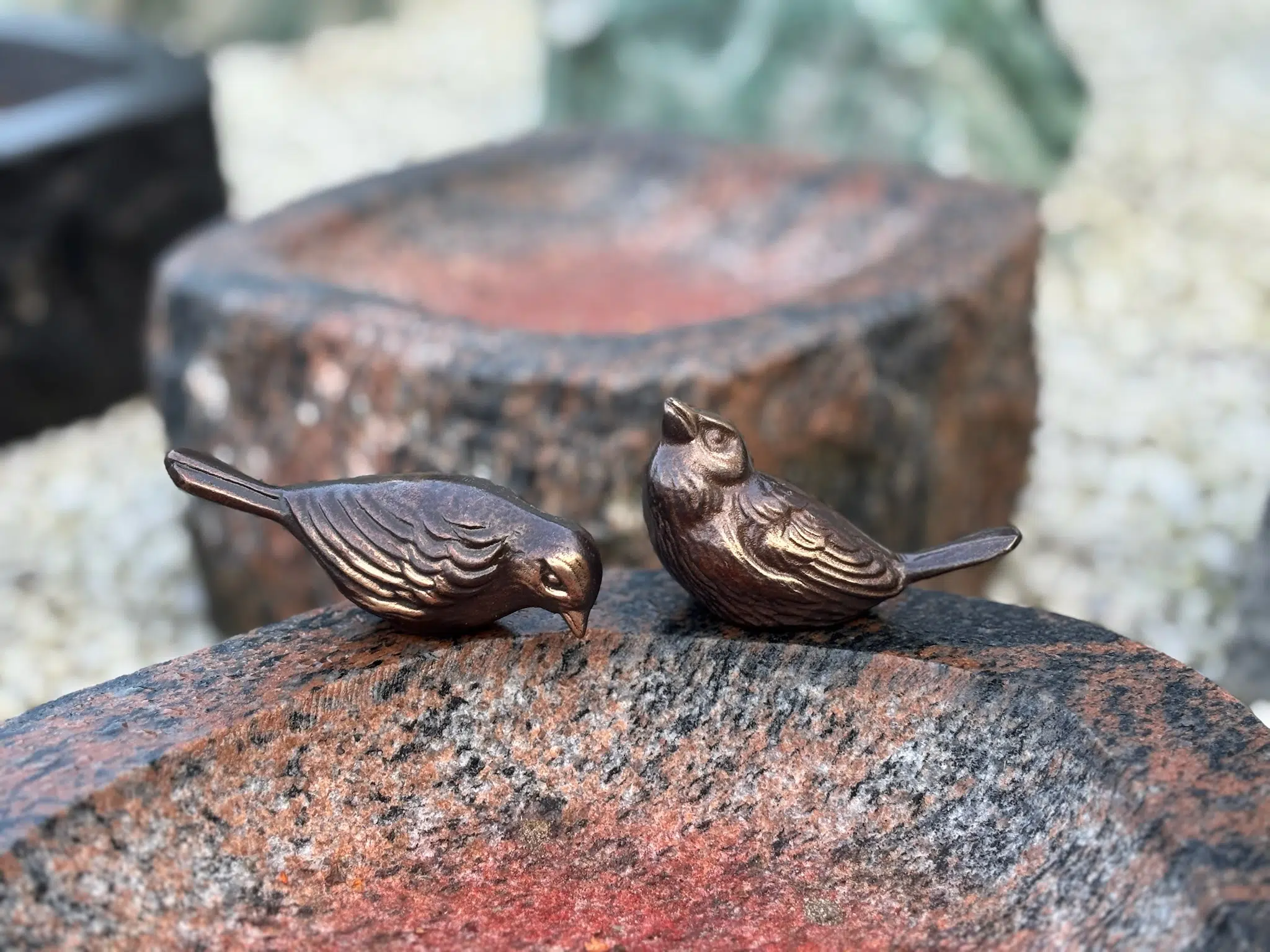 Et sæt med 2 store bronze fugle, er en smuk detalje på både gravsten og fuglebad.